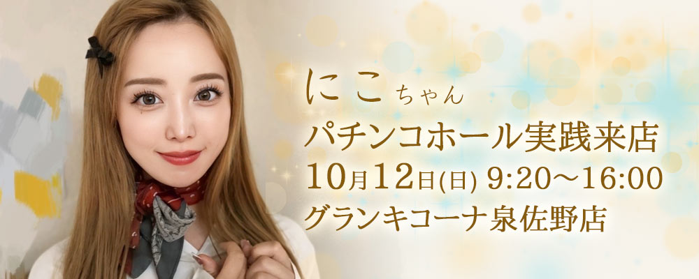 早くも再来、スロット大好きおねえさん にこちゃん 10月12日(日)、実践来店です 今月もぜひぜひご来店くださいませ♪ 【開催情報】 グランキコーナ泉佐野店 南海電車「羽倉崎駅」から徒歩10分 10:00 ~ 16:00 <9:20の整理券配布から参加> ・来店時間は天候・交通事情で変...